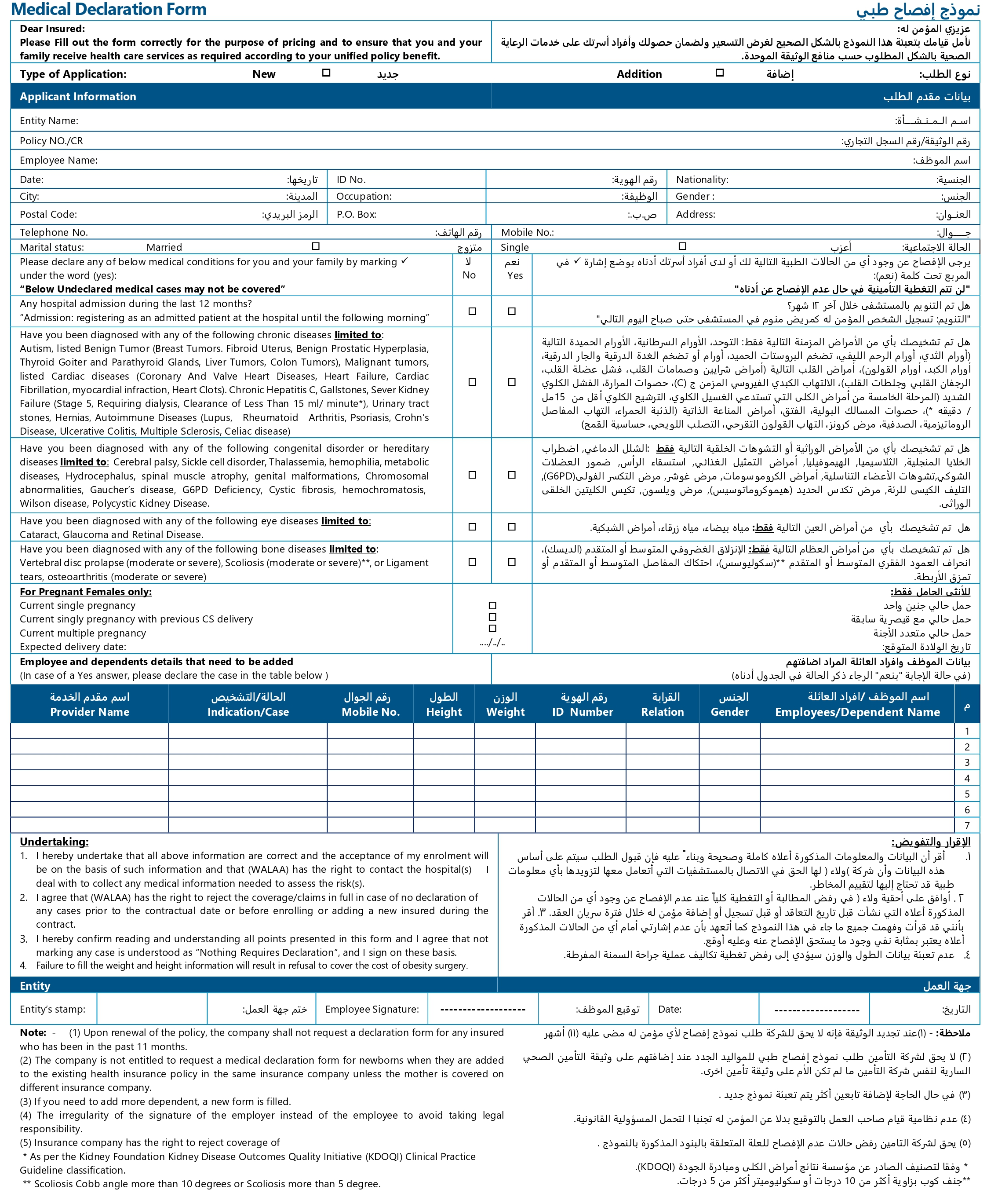 • على انه تم إبلاغنا فيما يتعلق بشروط وبنود برنامج التأمين الطبي وأنا / نحن نقبل هذه الشروط والبنود و أوكد/نؤكد على أن المعلومات التي تم تعبئتها في هذا الطلب كاملة و صحيحة و حيث أن هذه المعلومات ستشكل الأساس للتغطية التأمينية.